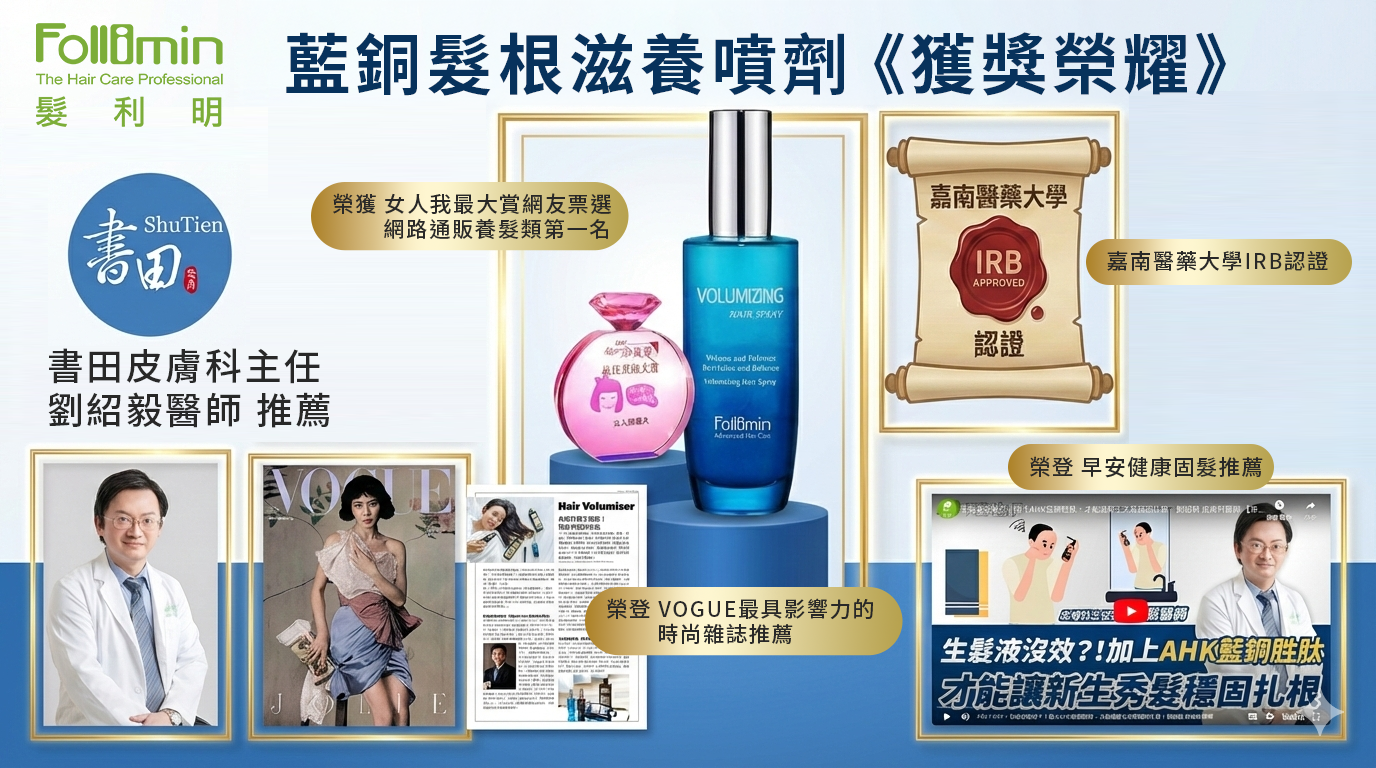 「劉紹毅醫師提出:很多有養髮需求者,雖然使用了相關產品護理,但卻疏忽了 『養髮之餘,固髮才是關鍵』。新生細髮如果沒有加強營養補給,往往容易脆弱、無法維持。建議大家在細心照護之餘,除了日常飲食中補充富含蛋白質和維生素外,還可以使用含 AHK藍銅胜肽 成分的養髮液,補充髮根所需營養修護元素,調理頭皮健康環境,幫助髮絲強韌豐盈,維持秀髮厚實感。」