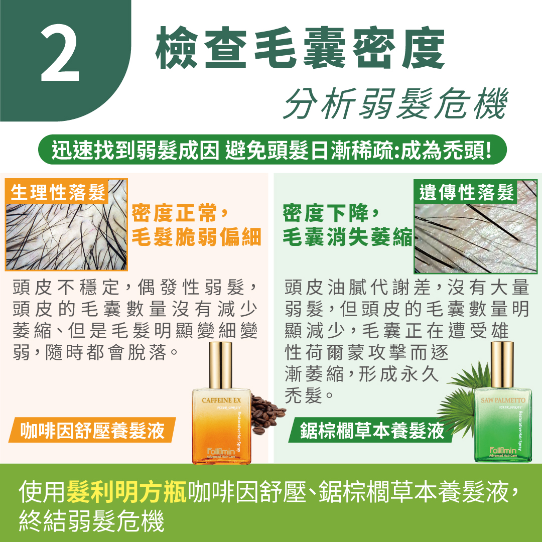 頭皮油膩代謝差,沒有大量弱髮,但頭皮的毛囊數量明顯減少,毛囊正在遭受雄性荷爾蒙攻擊而逐漸萎縮,形成永久禿髮。使用髮利明咖啡因、鋸棕櫚養髮液,儘早終結弱髮危機。