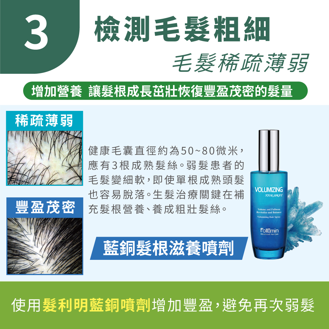 「數量」是生髮治療的關鍵步驟,先停止弱髮狀態,再把已經脆弱稀薄的髮絲養成粗壯的毛髮,恢復髮量避免再次弱髮。使用髮利明藍銅營養噴劑,可強健髮根、恢復頭髮豐盈茂密。