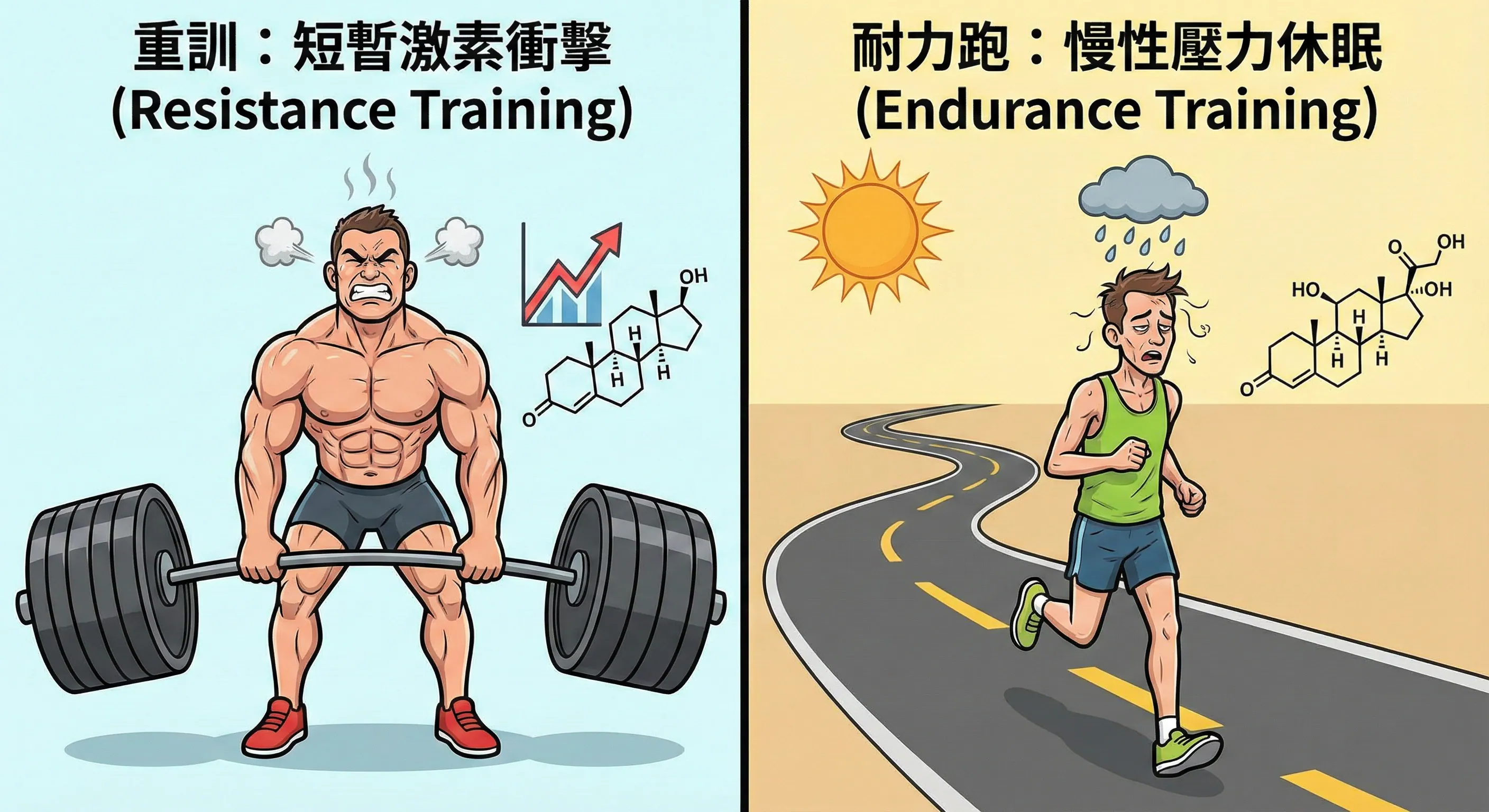 🏃♂️ 耐力訓練 (長時間):慢性的壓力測試 如果你是馬拉松、鐵人三項、高頻有氧……身體長期處於「壓力狀態」,長時間、中低強度的運動模式,對身體來說其實是一種「慢性壓力」。這時候主角換成了皮質醇 (Cortisol,壓力荷爾蒙)。